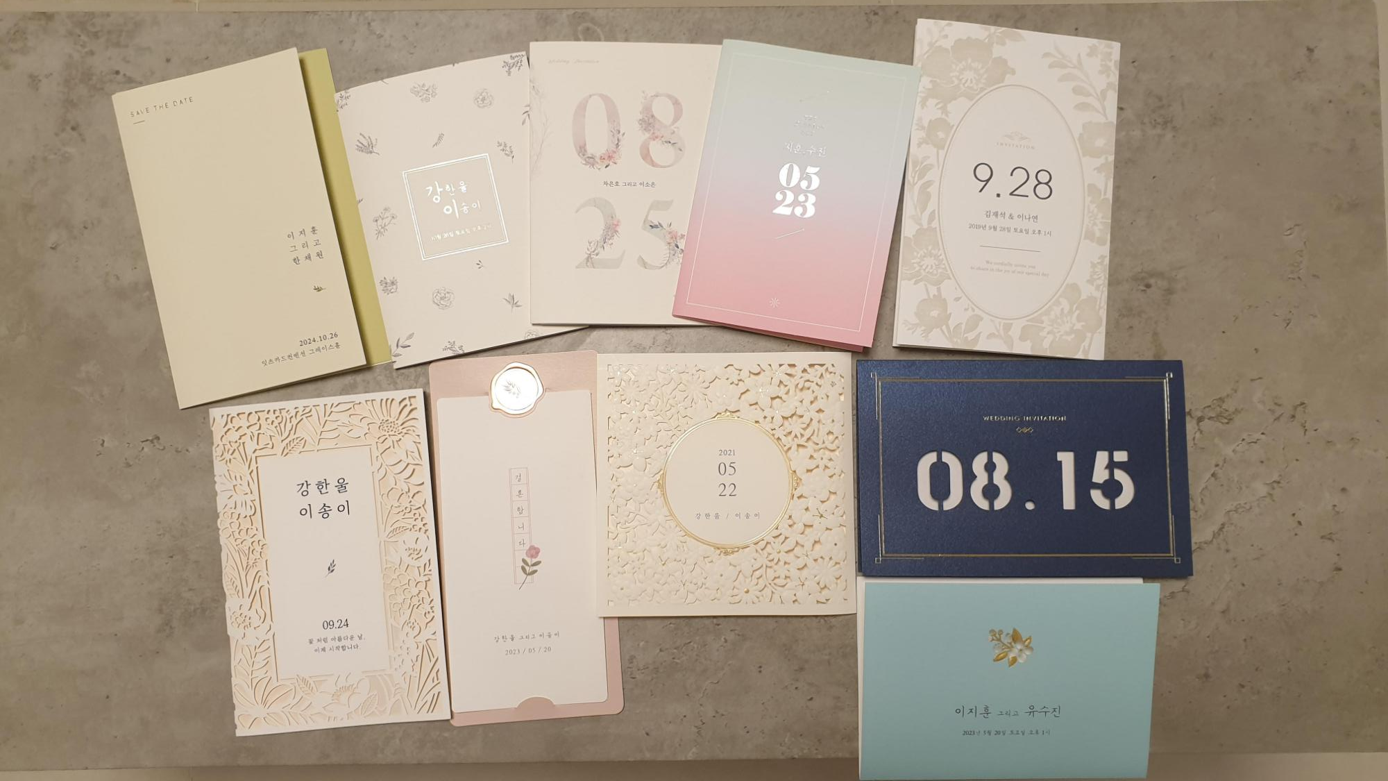 잇츠카드에 샘플신청했더니 총 10종류의 청첩장이왔습니다