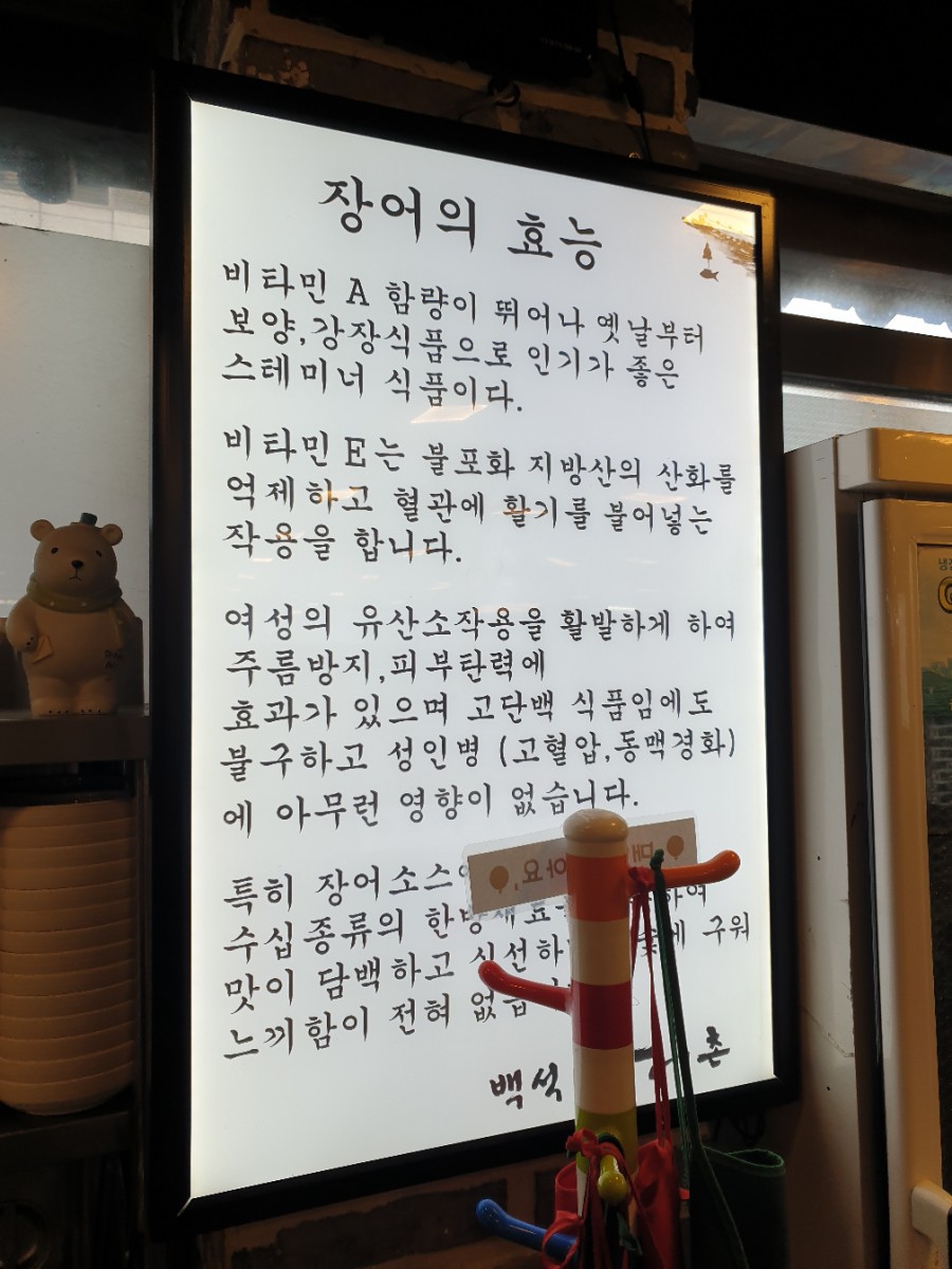 장어는 어떻게 굽냐에 따라서 맛이 정말 천차만별이더라고요. 때론 너무 식감이 좋지 않거나 때론 비린맛이 나거나 소고기도 누가 굽냐에 따라서 맛이 정말 달라지잖아요? 저는 장어도 그렇게 생각됩니다. 그래서 일산 백석 장어촌에서는 장어를 맛있게 굽는 방법이 안내되어 있어요. 한번 천천히 읽어보시면 금방 이해하실 수 있을 겁니다. 그리고 장어의 효능은 다들 아시겠지만
