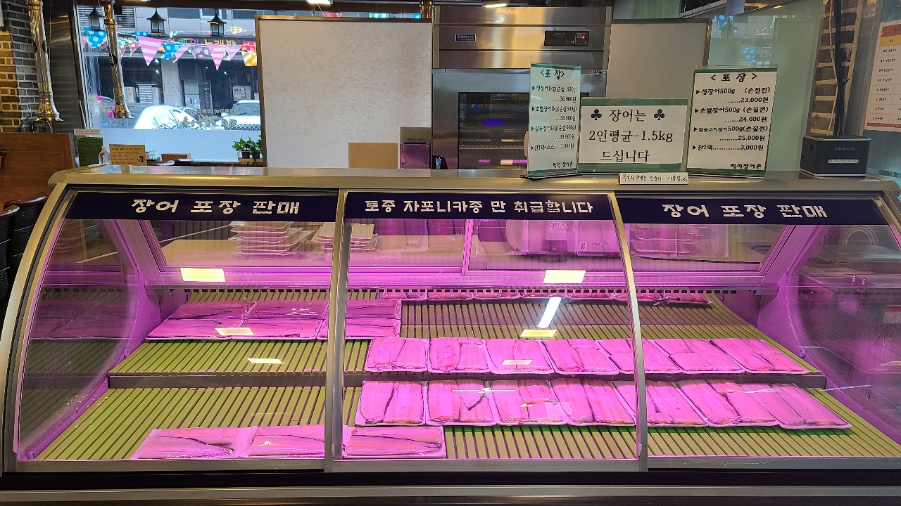 보통 정육식당에 가면 볼 수 있는 냉장고?라고 해야할까요. 랩으로 포장되어 장어가 진열되어 있으며 냉장고 위에는 2인 평균 - 1.5KG라는 안내와 함께 포장 가격에 대한 정보가 나와있습니다.