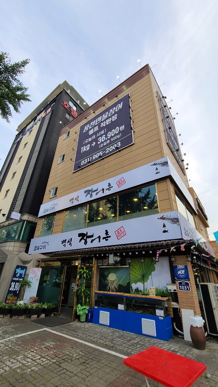 백석 장어촌 외관입니다. 풍천민물장어 셀프 직판장이라는 안내와 함께 오늘의 시세를 안내하고 있습니다. 오늘의 시세는 1KG->36,900원이며 손질 후 무게는 500g이라고 합니다. 일산 백석 장어촌의 장점이라면 외부에 주차할 곳이 여유 있습니다. 10대 이상은 가능할 것 같아요. 요즘은 집안에 한 대씩은 차량이 있기 때문에 주차공간도 상당히 중요할 것이라 생각하는데 그 걱정은 안 해도 될 것 같습니다. 오픈한지는 좀 되었지만 아직도 깨끗하게 유지되고 있는 느낌이었습니다.