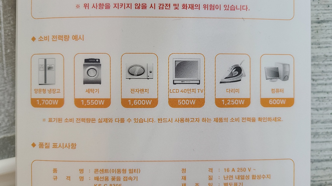 정격전류 초과 시 차단기가 작동하여 주변 건기, 전자 제품에 영향이 없도록 과부하 차단기가 내장되어 있으며 먼지 및 이물질 침투로 인하여 제품 오작동을 방지하기 위해 차단기 보호 커버도 있습니다. 이렇게 글로 되어있으면 이게 얼마나 중요한 내용인지 와닿지 않을 수도 있는데 화재가 날 수 있는 가장 큰 원인이라고 생각되는 이유들입니다.